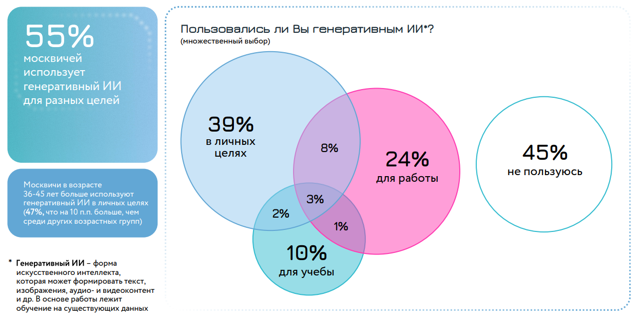 Генеративный ИИ – один из трендов 2025 года. По данным исследования, его использовали 55% опрошенных москвичей, как в личных целях, так и для решения рабочих задач. Чаще всего генеративный ИИ помогает москвичам искать информацию.